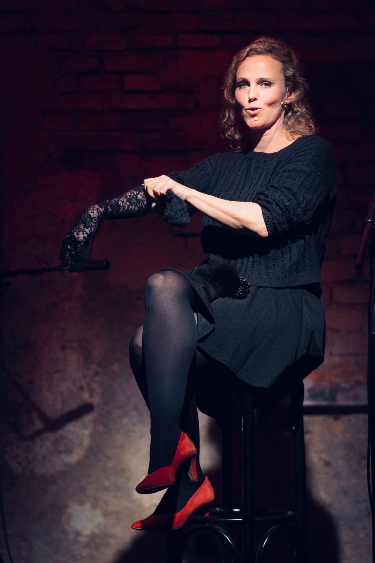 Auf der Bühne verbindet sie diese Erfahrungen zu einem vielschichtigen Ganzen: Mit Gitarre und ausdrucksstarker Stimme schlägt sie den Bogen von Vintage-Chansons der 20er Jahre bis hin zu modernen eigenen Songs. Dabei blickt sie als ausgebildete Therapeutin mit scharfem Verstand auf alles, was uns Menschen so umtreibt – und lacht dabei mit viel Selbstironie am liebsten über sich selbst.